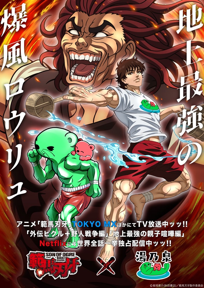 Netflixにて全世界独占配信中、さらにTOKYO MXほかにて好評放送中のTVアニメ『範馬刃牙』と、「湯乃泉 草加健康センター」と「湯乃泉 厚木健康センター」が、2024年2月1日(木)〜3月31日(日)までコラボイベントを開催します。